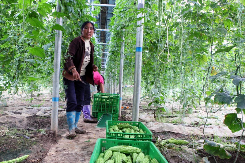 ▲8月1日,草海镇鸭子塘村村民在大棚蔬菜种植基地喜收苦瓜。据悉,近年来,该村两委积极带领农户进行产业结构调,探索出一条独具特色的蔬菜种植之路,并形成了"公司+农户"的产业模式,年促进菜农增收万余元。(本报记者 文贵 摄)