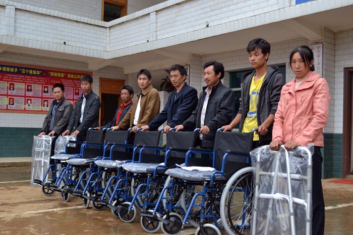 ▲8月2日,秀水乡妇联向残疾人发放助残物资。图为残疾人家属领领到了轮椅。(朱剑 摄)
