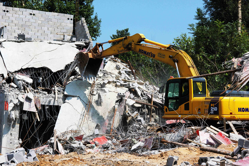 8月3日,自治县人民政府组织公检法司等多部门联合执法,在草海国家级保护区内拆除一违章建筑。据了解,其余3处违章建筑房主承诺自行拆除。图为挖机正在施工作业。(拆迁办)