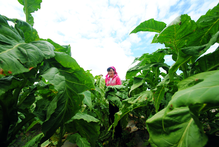 自2010年我县启动“高原烟海”计划以来,在惠民政策和资金投入上,最大限度引导和鼓励全县群众发展烤烟种植业,仅小海镇今年就发展烤烟1.4万亩。图为8月2日,一名妇女在小海镇松棵村抢收烟叶。(本报记者 杨文斌 摄)
