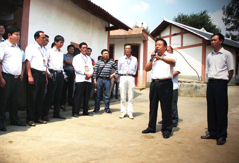 全省九个地市爱卫办主任,26个县创卫办主任及卫生局局长,我县创卫工作各主创单位负责人,各乡镇党委书记或乡镇长参加了会议。图为与会人员到么站镇新房村参观时杨兴友在向他们介绍我县村庄整治的经验。(本报记者 何 欢 沈光勇)