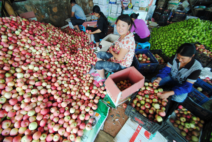 目前,随着二十四节气中的“立秋”时节到来,千亩生态水果喜获丰收,每天都有20余吨水果批发外运销售,红彤彤的嘎啦苹果、脆生生的早酥梨、金灿灿的大黄梨,成了当地农民致富增收的好渠道。图为果场工人们在给苹果分等级装箱。(本报记者 杨文斌 摄)