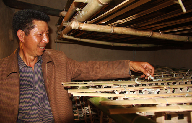 在赵远美养蚕的房间里,记者看到,一个个蚕蛹已开始欢快的吐丝结茧。赵远美告诉我们:“这是第一次养蚕没经验,公司直接派技术人员住在家里指导。养蚕不多,只养了一张大概有8000来个蚕蛹,四五天后便可以出售,公司约定以35元左右每公斤的价格回收,一张大概可以卖450元左右。今年还可以养三次,下次养的就比这次多了。今年养蚕有望收入3000元左右。”
