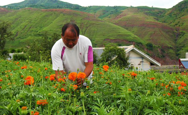 去年7月,有乡干部听说气候与玉龙相似的云南开远、沾益、会泽等地正大面积种植万寿菊,而且收成不错。于是立刻上网查看万寿菊的生活习性:万寿菊喜湿、喜光、耐旱,对土壤要求不严,适宜在砂质、排水透气好、海拔2400米以下的土壤生长。“万寿菊”寓有吉祥之意,很早就被人们视为敬老之花,就是当地所说的“臭菊花”,现在主要用来提炼食用色素E161b。
