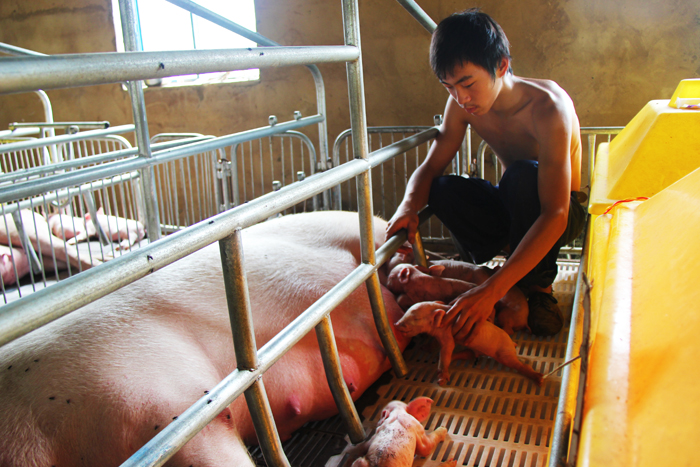 在合作社的养猪场内,记者算是第一次见识了现代化的养殖。在能繁母猪养殖区,一个个单独的栅栏内,一头头肥大的能繁母猪个头看起来有本地母猪两个大,一个个猪仔正欢快的吮吸着母乳,旁边还专门配置了温箱。饲养人员在不停地交换刚出生的猪仔的位置,以保证它们都能公平的吃上母乳而不被挤压。