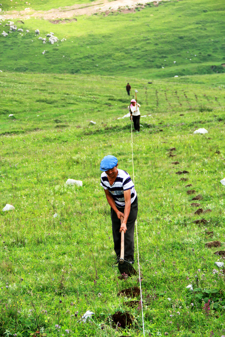 ▲8月11日,记者在百草坪上看到,工人们正在草山草坡上拉线挖坑栽草,有序忙碌着。据了解,为了进一步美化百草坪的风景,我县投入99.45万元,实施百草坪石漠化草地改良项目7396亩。图为当地群众在种草。(本报记者 李玉荣 摄)
