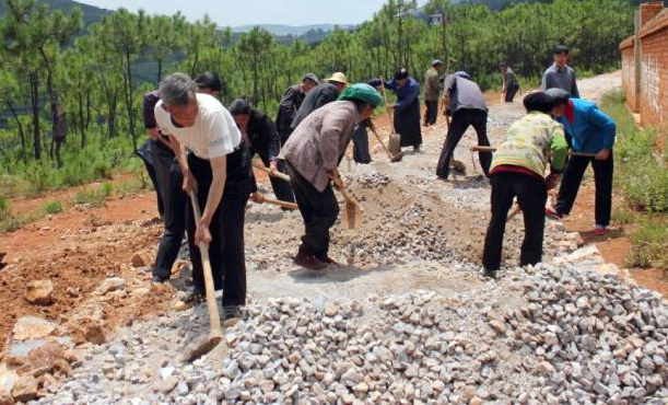 ▲近日,笔者在斗古乡斗古村“一事一议”财政奖补项目工程现场看到,一群老党员正在工地上铺沙石,个个累满头大汗。 据了解,今年该村争取到“一事一议”财政奖补资金58万多元,现已修建通组路2360米,联户路4300米,预计9月底完工。图为老党员正在工地上修路。 (朱俊 摄)