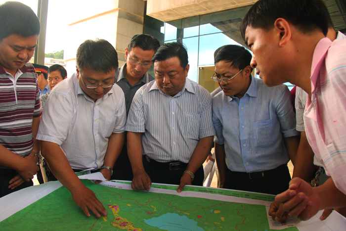 座谈结束后,调研组还深入草海国际养生基地参观了奇石园和草海风光。图为练发胜(前排左四)在杨兴友、陈波陪同下草海站调研时察看站点规划图。(本报记者 叶启伟)