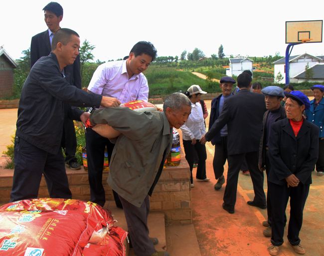 据了解,在开展保持党的纯洁性教育活动中,县委办积极组织干部职工开展献爱心捐款活动,共捐献资金5000元,为海拉乡海元村20户贫困群众购买了大米、食用油等生活用品。图为工作组在为20户贫困群众发放大米、食用油等生活用品。(本报记者 叶启伟)