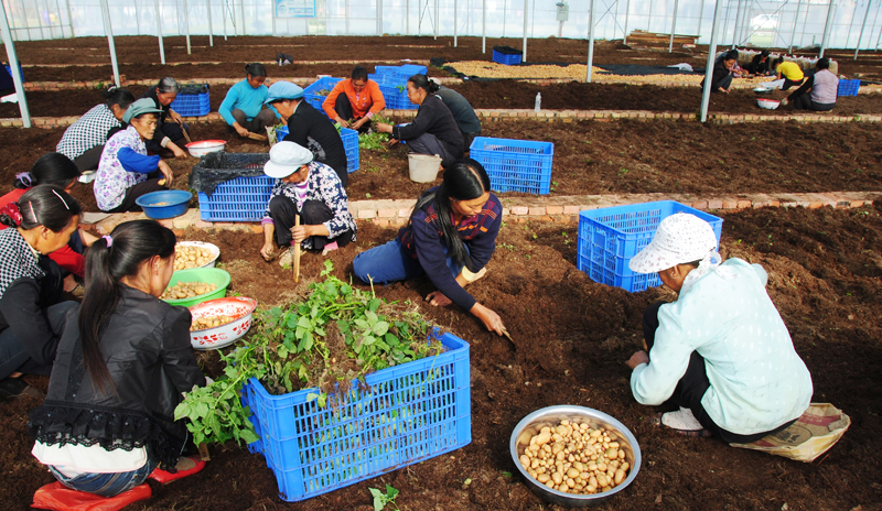 草海泰丰园自去年开工建设以来,紧紧围绕市场为导向,有计划、有步骤地研发特色作物良种,引进现代经营管理理念,采用现代农业高新技术。目前,该项目带动周边近千名妇女实现家门口就业,每月可获得1000元至1500元不等的报酬,极大地解决了农村剩余劳动力问题。图为8月19日,妇女们在泰丰园脱毒马铃薯原原种生产中心打工。(本报记者 杨文斌 摄)