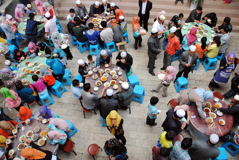 ▲8月20日,我县回族同胞在城关清真寺开斋节仪式上聚餐。据了解,开斋节是伊斯兰教最重要的节日之一,而穆斯林群众会在一年一度的斋月结束后,熏香沐浴,前往清真寺参加盛大的会礼,集体礼拜,和家人同胞一起聚餐、传油香、并走亲访友,共庆节日。(本报记者 杨文斌 摄)