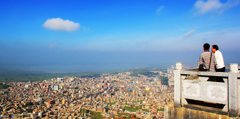 会当绝凌顶,一览众山小。站在凤山之巅,倚栏俯瞰,高原“阳光城”,草海明珠,一览无余。图为两位游客正迎着清风,沐浴阳光站在凤山之巅观赏威宁县城风光。