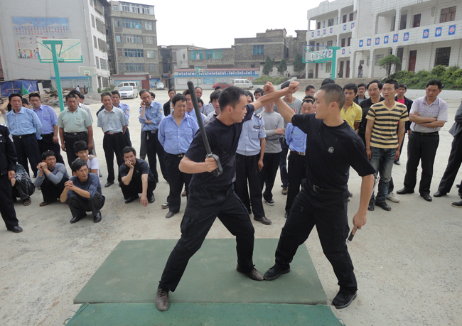此次培训通过理论与实际、实践与技能的专项集中培训,使全镇各校点保安人员掌握了熟悉的工作技能,熟知了相关法规,为增强各学校自防自卫能力,建设平安和谐校园,维护草海镇社会稳定奠定了坚实的基础。图为警官向学校安保人员演示警棍的使用方法。 (周 鑫)