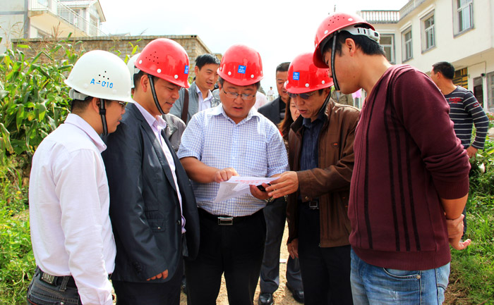 住建局、规划局、征拆办、草海镇等有关单位和施工企业负责人参加开工仪式。图为陈波在查看草海旅游慢行道施工方案。