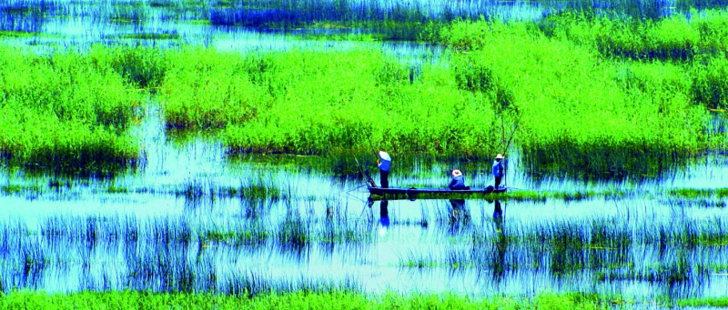 宁静的天空,宁静的山,宁静的破旧长堤,再也寻不到长辈谈论的秋水共长天一色的景象。还算幸运,近十多年来草海恢复了部分水面,可远远看到几只不知叫什么的名字的鸟在慢慢的与落霞齐飞。缓慢的走上几步,脚下残堤似乎在轻轻的告诉我这里曾住过神仙吕洞宾,曾有很多墨客骚人在楼内亭外堤上吟诗作对,把酒问青天,也曾有过不少痴情男女在此诉说衷情……