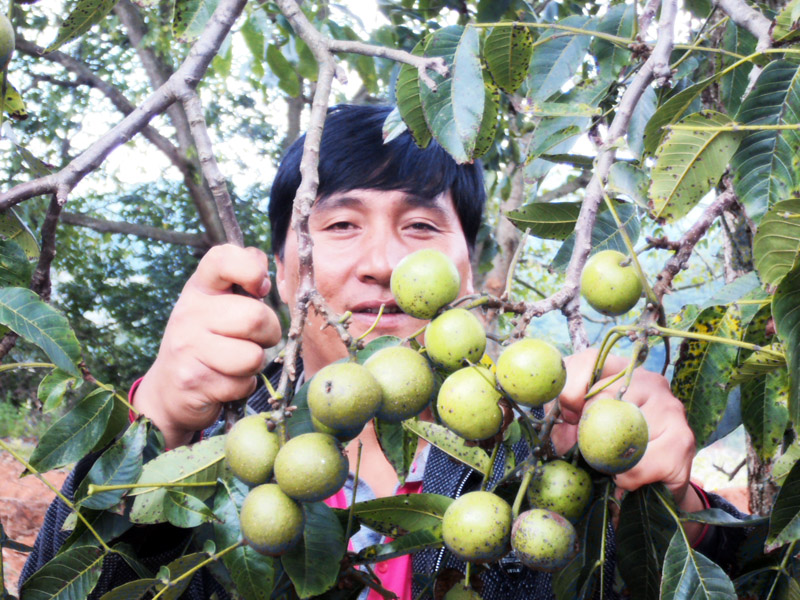 近日,记者在麻乍乡岩格村看到,挂果的核桃长势良好,一片丰收在望的景象。据了解,近年来,岩格村大力发展核桃树种植,核桃产业已成为当地农民增收致富的“摇钱树”。图为村民李才配家种植的核桃树挂满了果实。(本报记者 胡雍辉 摄)