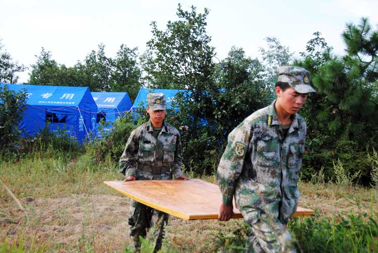 武警官兵在帮助云贵乡检角村受灾群众搭建临时厕所。