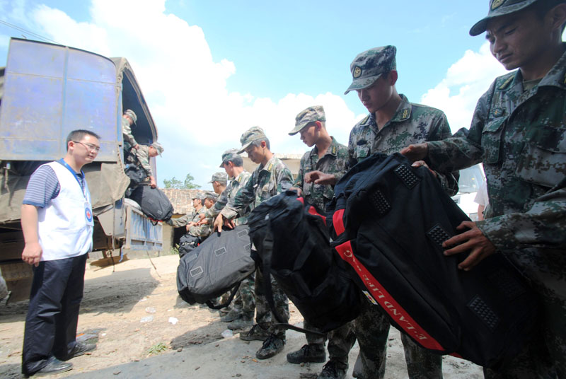 一方有难,八方支援。 9·7地震后,社会各界纷纷向我县地震灾区伸出援助之手,慷慨解囊,截止9月13日,已收到社会各界捐助物资折合人民币459万元,现金1910万元。图为省红十字会把紧急捐助帐篷、便民生活包、大米等价值10万元赈灾物资及时发放给云贵乡检角村灾民。 (本报记者 杨文斌 摄)