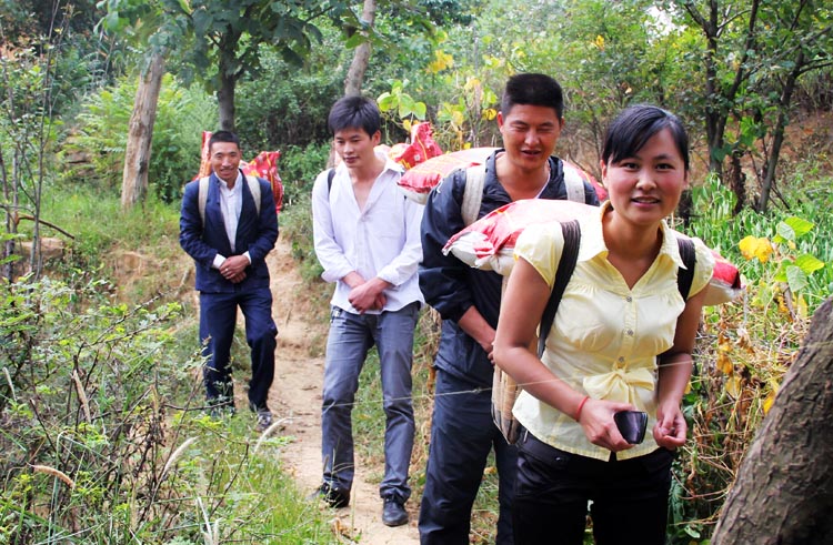 ▲连日来,牛棚镇党员干部发扬“背篼干部”精神,用背篼背着大米到手工、营上等村,为遭受“7·11冰雹灾害”的贫困党员送去大米、食用油等物品。图为“背篼干部”运送大米。(冶付红 摄)