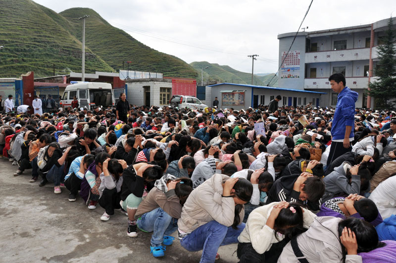 ▲9月13日,为提高师生防震减灾意识,东风镇中学举行防震应急演练,以此提高学生在密集场所的应急避震能力,如何在地震发生后,快速、有序地躲避。图为演练现场。(姚文森 摄)