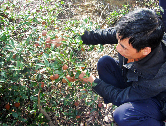 ▲近年来兔街乡积极调整产业结构,以促进农业增收为抓手,把油茶种植作为重点产业来打造。目前兔街乡天然生长和人工种植的油茶达1万亩,到挂果期每株可产茶籽5斤,每亩每年净收益可达500元左右,年产值达500万元。图为一名工人在采摘油茶。 (王志勇 摄)