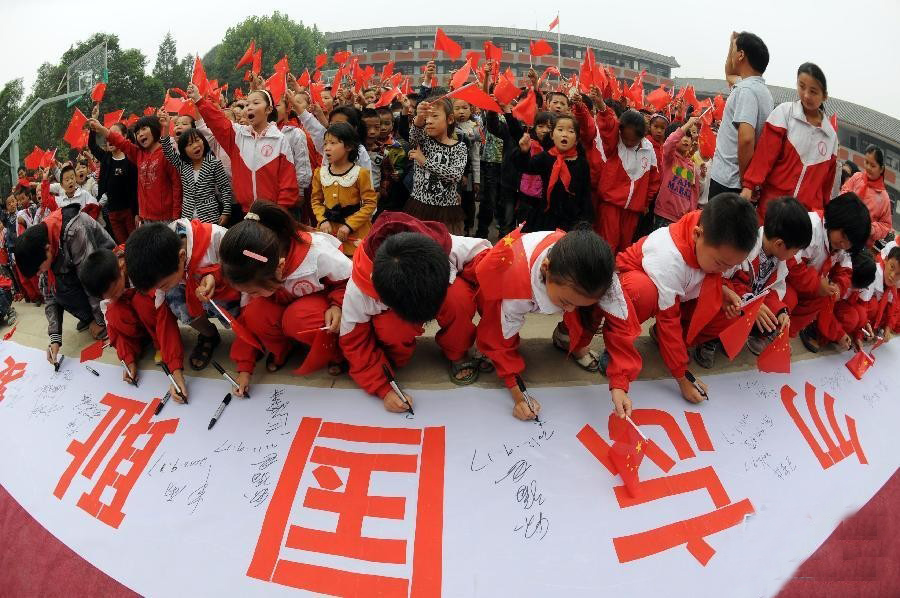 9月17日,在安徽省亳州市谯城区薛阁小学,学生们在“勿忘国耻 爱我中华”横幅上签名。当日,安徽省亳州市谯城区薛阁小学举行了解“九一八”事变的主题教育活动。( 新华社发) (张延林 摄)