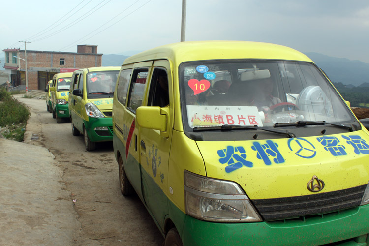 ▲近日,记者在云贵乡看到,几十辆小型客运车车门上用红纸书写着 “团结一致抗震救灾”、 “万众一心众志成城”、“一方有难八方支援”等标语。据了解,这是小海镇农村客运车辆自愿帮助地震灾区运送客人和货物。图为帮助灾区运送客人和物资的农村客运车队。(本报记者 胡雍辉 摄)