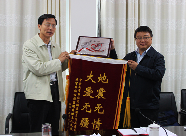 国开行贵州分行党委书记、行长王永进(左1)向我县灾区捐款后,接受我县赠送的感谢锦旗。