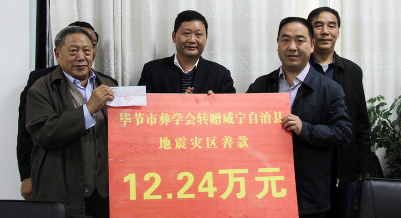 9月24日,毕节市彝学会向我县捐赠抗震救灾善款12.24万元(如图:毕节市彝学会会长陈霖(左一)进行善款捐赠)。