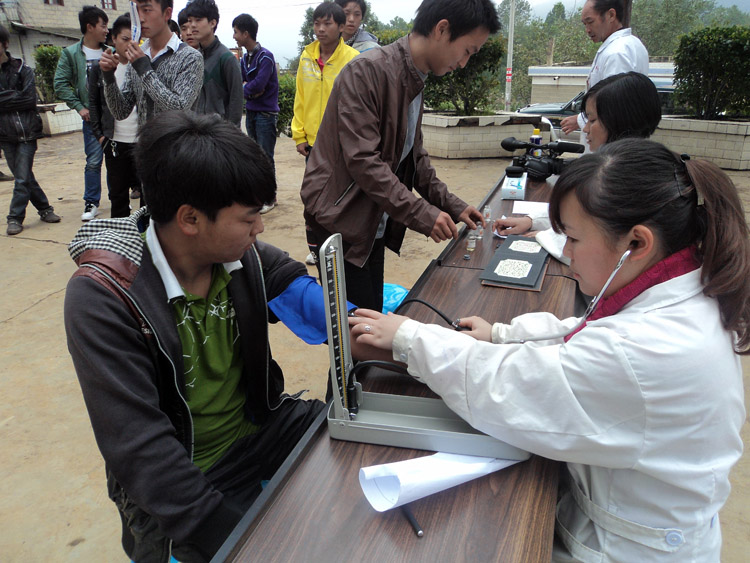 ▲9月24日,龙场镇开展2012年冬季征兵预检工作。当日,在县武装部相关工作人员的监督下,来自干河、树舍等村的16名符合条件的应征青年逐一参加血压、口腔、视力色觉、身高体重等项目的体检。据悉,此次征兵预检的各个项目均严格按照征兵体检的要求和顺序进行,预检合格人员将按通知按时到县医院参加复检。图为应征青年在测量血压。