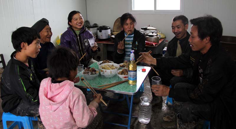 桌子上已经摆满炒腊肉、炒洋芋等热乎乎的一盘盘的菜肴。大家围坐在一起,一边吃着饭菜,一边相互交谈着地震后生产生活中存在的困难和灾后重建的打算。