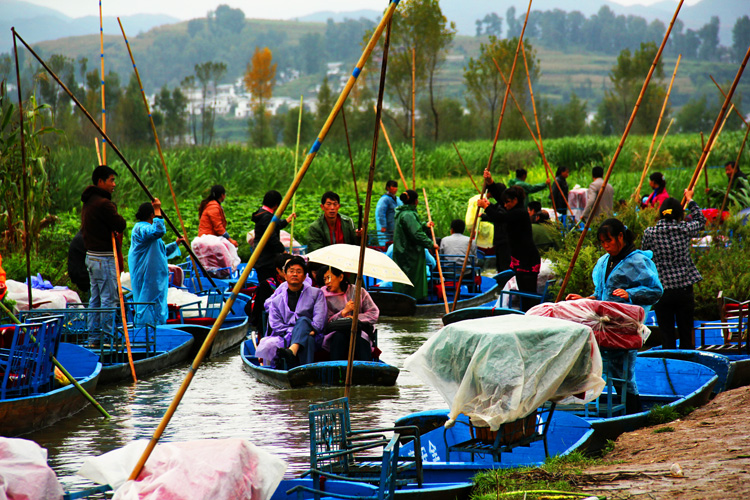 ▲10月3日,国庆黄金长假第四天,来草海游玩的旅客络绎不绝。图为草海码头船来船往,热闹非凡。