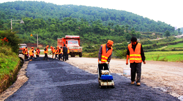 ▲中秋国庆长假期间,我县养路工人放弃节假日的休息,忙碌在工作一线。图为养护工人在326国道线上补路的场景。(本报记者 李玉荣 摄)