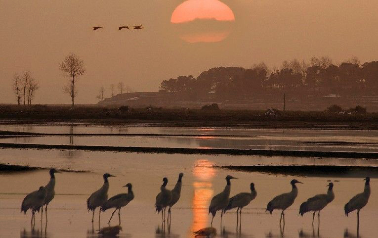 乘坐的小船在一个长渚旁停下,我们静静地看着上面悠闲觅食的黑颈鹤,它们时而抬头看看我们,时而低头觅食。我暗自庆幸竟能如此靠近欣赏黑颈鹤的美姿。渔夫开玩笑戏我,说不定它们也在欣赏我们呢!突然,那几只黑颈鹤组成一条直线,像爵士马奔跑起来,拉直脖子向天长啸,好像在吟唱长长的诗歌。此刻,我不知道李白的灵魂是否还骑着黑颈鹤登上瑶池呢。