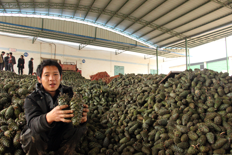 ▲近来年,雪山镇以建设“高山绿色经济园”为目标,大力加强对林果业产业的投入力度,积极实施封山育林和人工造林工程,共完成荒山造林10多万亩,真正做到“造一片、活一片、成林一片、收益一片”,为广大林农带来了实实在在的收益。据了解,该镇有各种松树林15余万亩,其中可采果松树5至6万亩,三年生幼树10万余亩,是华山松采种基地,今年雨水充沛,松子大丰收,街上到处可见运松树孢子的拖拉机,一般每斤1.1至1.25元。图为已集中收购的松子孢。(李建军 摄)