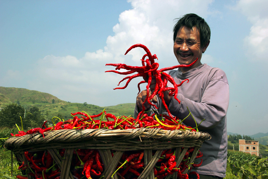 ▲10月10日,中水镇前河村的田坝里,忙碌的村民正在蔬菜基地里摘辣椒。据了解,基地以辣椒、茄子、莲花白等蔬菜为主,种植面积达4000余亩,产值4000余万元。图为菜农脸上露出丰收的喜悦。(记者 沈光勇 摄)
