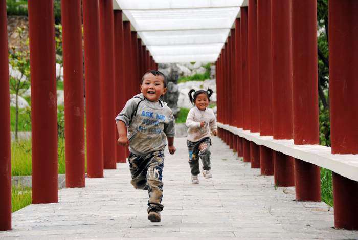 图②:金钟镇大营村的孩子们在小广场里赛跑玩耍。