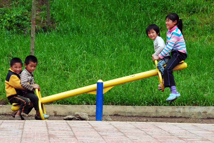 图③:金钟镇大营村的孩子们在小广场里玩跷跷板。