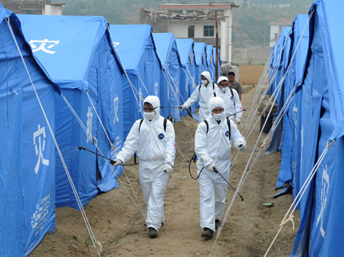 9月11日,消杀组再次对受灾较为严重的云贵乡受灾百姓的室内外环境和饮用水进行消杀工作。共对52受灾户进行室内外环境消杀,消毒饮用水2400立方米,消毒厕所31个,消杀室内外环境面积为11000平方米,本次消杀工作共用去漂白粉40斤,奋豆呐13小包。致使到目前为止,在整个抗震救灾防疫工作中,灾区未发现任何疫情,消杀工作还在继续,在村民中宣传防疫防病不会中断,消杀组将继续对灾区进行消杀,努力夺取抗震救灾的最后顺利。
