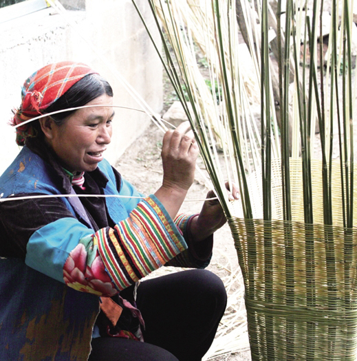 安正兴是划竹丝的好手,一根长长的竹子在他手中瞬间就是一丝丝竹条,划给他的妻子杨飞英编织箩筐。杨飞英的手势非常敏捷,她用宽一点的竹片做箩筐筋,起好箩筐底,用两条竹丝一根连着一根,两条竹丝犹如两条线在杨飞英的手中飞快地穿梭,渐渐地一个精致漂亮的箩筐呈现在大家的面前。