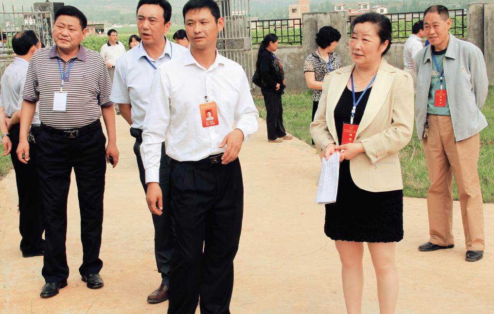 自治县委常委、政法委书记赵毅(前排右一)在迤那镇指导党的纯洁性教育试点工作。