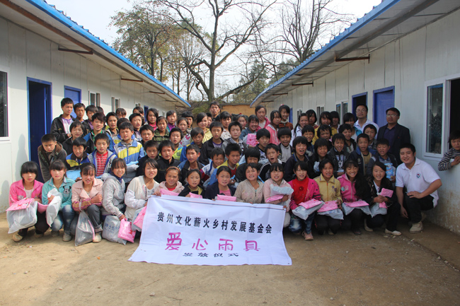 10月23日,贵州薪火乡村发展基金会到石门乡营坪小学开展献爱心活动,为该校学生捐赠300件雨衣和300双雨靴,价值1.1万元。图为该基金会会员与学生合影。(王迪 摄)