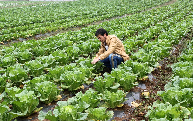 近日,记者在小海镇松山标准化蔬菜基地看到,成片的大白菜、娃娃菜、青花菜、花椰菜长势宜人。据了解,该基地建设标准化核心示范蔬菜基地1000亩,带动周边发展蔬菜种植1万余亩,使当地群众实现家门口就业。图为菜农正在检查白菜生长情况。 (本报记者 胡雍辉 摄)