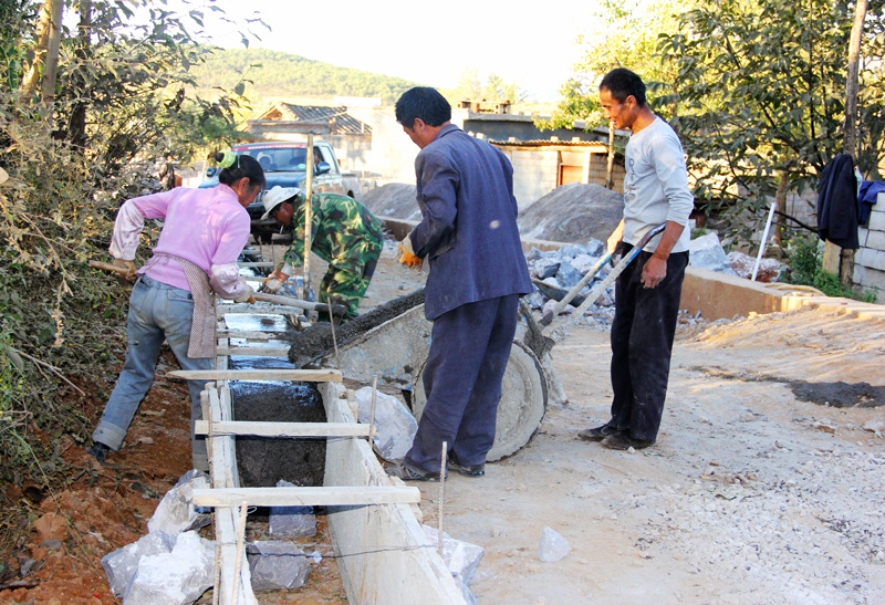 日前,盐仓镇大路村全面启动“一事一议”工程,县财政投入财政奖补资金250余万元,共实施通寨路硬化4317米,硬化人行道6521米,修建小广场1个,公厕1个,垃圾池5个,安装太阳能路灯40盏,排污管道420米。工程完工后,该村1200多村民直接受益。图为火热的劳动场景。(本报记者 李玉荣 摄)
