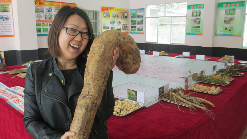 该镇合作联社的实施,使广大药农乐开了怀。“不用投成本,不用承担风险,租地又得钱,还能享受70%的分成,这种空手赚大钱的好事谁不喜欢啊。”正在地里采收百合的公平村村民陈永红笑呵呵的告诉笔者。图为特色产业合作联社产品展示区的巨大中药材葛根。