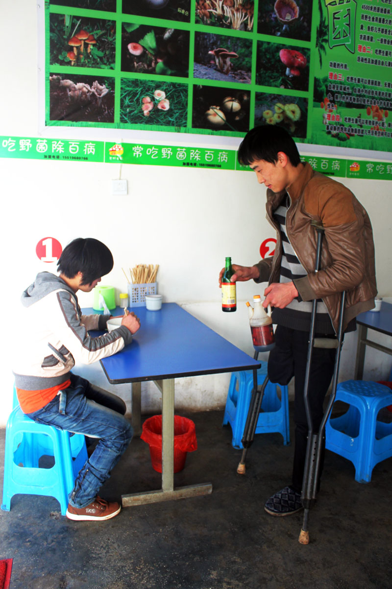 采访临近结束时,陈云告诉记者,他想通过自己的经历告诉所有的残疾朋友,要热爱生活,要珍惜生命,身体的缺陷并不代表一事无成,只要有信心和决心,生活的每一天都是美好的,残疾人的生活不是想象中的那么困难,只要付出、只要努力,一定会有回报,成功就在面前,看到顾客们吃着香喷喷的野蘑菇炖鸡粉是他最大的快乐和幸福。图为陈云正在服务顾客。