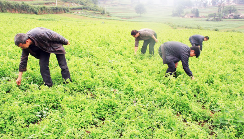 ▲羊街镇西华村村民姜榜玉带头创办恒富种养殖专业合作社,共流转土地500余亩,解决当地100多名村民就业。今年该合作社种植党参、白术、半夏等中药材,还饲养能繁母猪、优质黑山羊等。为当地群众找到了一条脱贫致富的新路子。图为工作员工正在查看党参长势。(本报记者 胡雍辉 摄)
