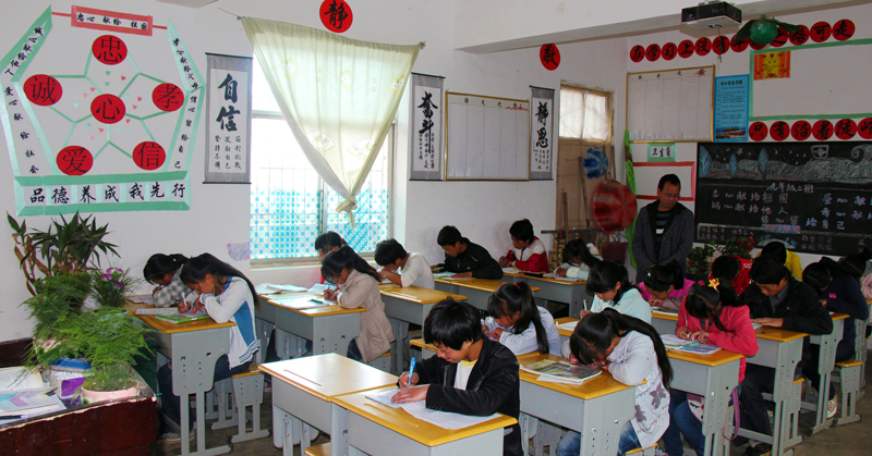 ▲草海镇赵山小学在办学中着力在“特”字上下功夫,校园文化建设丰富多彩、突出特色,班级文化建设突出班级个性,有雨点班、翱翔班、春雨般、扬帆班等等,各班还有不同的班旗、班规、班歌。图为该校独具特色的教室一角。(记者 叶启伟 摄)