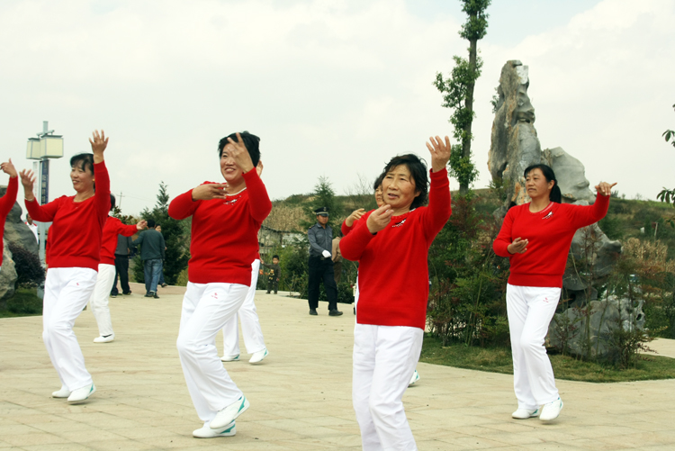▲伴随着欢快的舞曲,扭起轻松的秧歌。清晨,一群身着盛装的老年人在草海奇石园载歌载舞。据了解,这些老年人大多在60岁以上,她们自发组织起来,编排一些民歌,歌颂改革开放带来的新变化,喜迎党的十八大胜利召开。图为老人们表演扭秧歌。(本报记者 王德聪 摄)