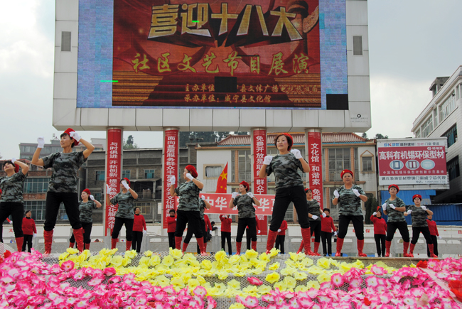 为迎接党的十八大顺利召开,11月3日,我县特举办“喜迎十八大·社区文艺展演”活动。当日,来自县城各社区的20支代表队以《好日子》、《越来越好》、《祖国颂》等舞蹈表演形式,展现了我县人民祝福祖国越来越富强,喜迎十八大顺利召开的美好愿望。图为“阳光海韵”社区在表演舞蹈《我们的钓鱼岛》。(记者 杨文斌 摄)